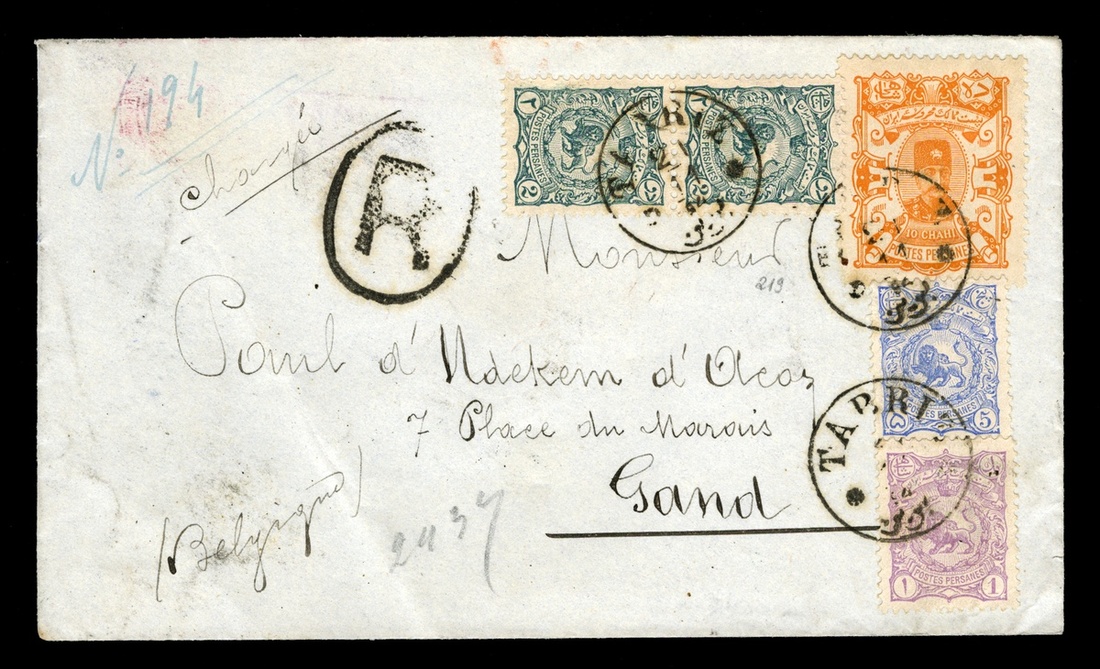 #94, 1894 10c Orange, along with 1c Lilac, 2c Blue green and 5c Ultramarine of the same series (#90-92), all tied to1894 registered foreign mail cover to Belgium by three strikes of "Tabriz 21/11" c.d.s., backstamped Gand, light cover crease of little consequence, otherwise an attractive registered cover.