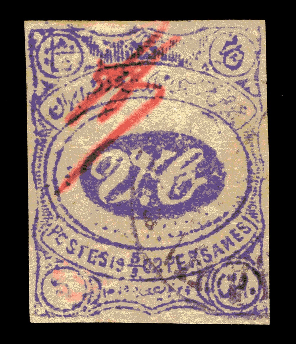 #225, 5c Violet Meched Provisional on wove paper, first state printing with late contral without extra loop, a postally used example with a rare violet Choutchan cancel, clear margins all around and remnants of brown gum on the reverse, fine; cancels other than Meched are extremely rare and the town of Choutchan is the rarest but also best documented; G. Karman documented only five examples known, all on 5c Violet, one on cover, one on card, one on piece and two loose stamps; signed W. Sellschopp slightly showing through.