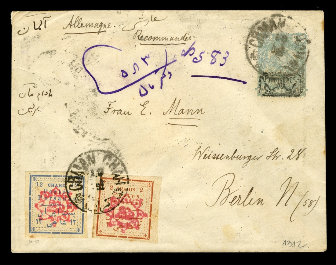 #248, 252, 1902 2c Brown and buff and 12c Ultramarine and buff with red control overprints, tied to 1902 10c Blue postal envelope with black "Provisoire 1316" with black serpents heads, stamps tied by and envelope cancelled by "Craman Chah" c.d.s., registered to Berlin with Tehran and Baku (Russian Azerbaijan) transits and backstamped Berlin; very fine a scarce postal history item as well as an excellent reference for the red and black control handstamps.