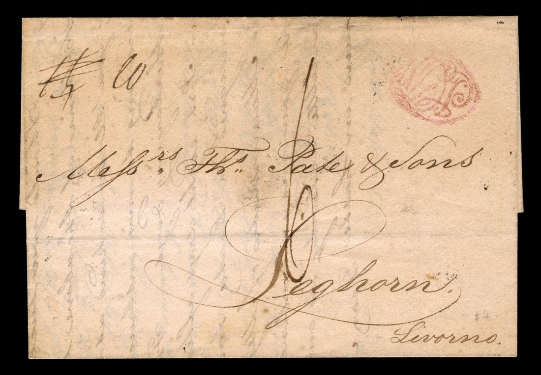 Naples 1837 disinfected cover, folded letter from Naples to Livorno with magenta "AGP" dispatch postmark on front, and on reverse magenta "Napoli/10 Gen" and the disinfection mark "Netto Fuori/E Sporca Dentro" of the Pontifical States (Meyer catalog type 1) applied in transit, the Tuscan "Siprintendenza Gle./di Sanita a Firenze" also applied in transit (Meyer catalog Firenze type 1) and "16/Gennaio/1837" arrival backstamp, rated "15" grana crossed off and corrected to "20" grana and "6" crazie" postage due for internal handling, very fine; one of only two cover with this Papal States marking recorded by Meyer; 2012 Sismondo certificate.