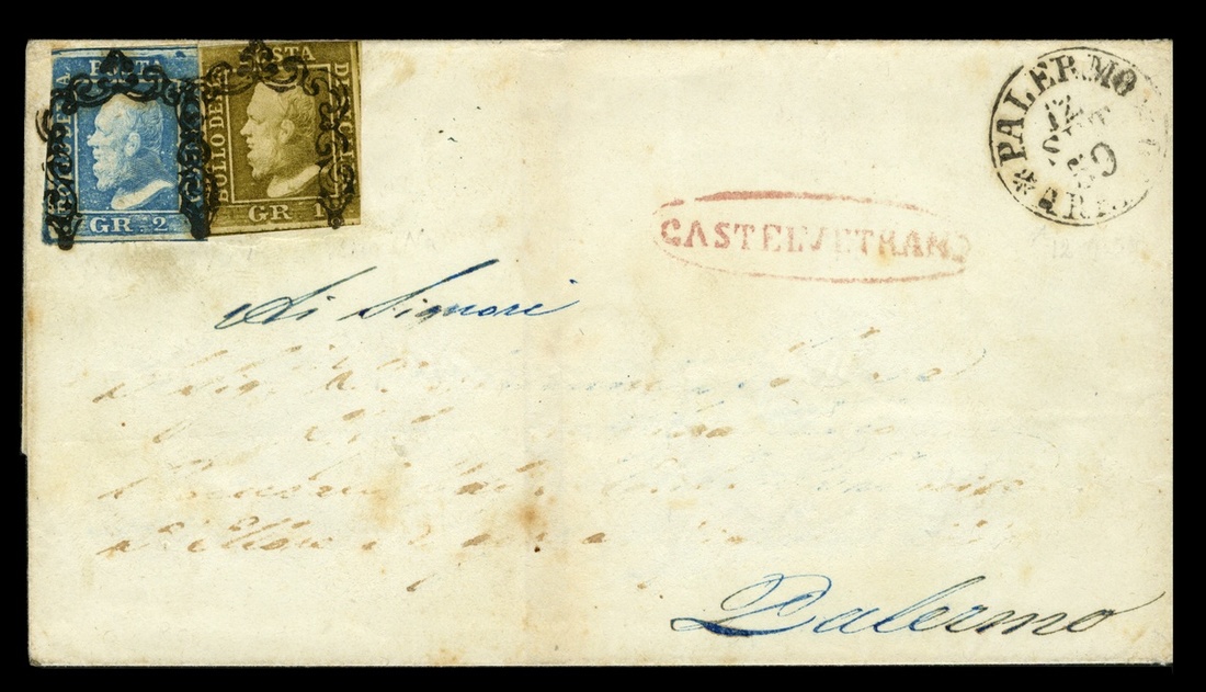 Sicily #12b, 13h, 1859 1g Olive brown, plate 2 and 2g Pale blue, plate 1, Palermo consignment, singles of each, margins to cutting, tied to folded cover and each other by two strikes of fancy horseshoe postmark applied upon arrival in Palermo, the cover sent unpaid with red oval "Castelvetrano" dispatch postmark, Palermo arrival datestamp, cover with address mostly erased, otherwise fine; 2011 Sismondo certificate (Sassone #4d, 6).