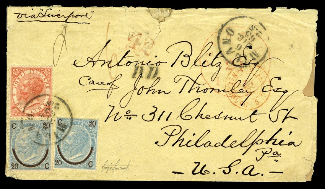 #33, 1863 2L Vermilion, De La Rue printing, nicely centered, tied along with two 20c on 15c Blue, Ty III (#34b) by "Milano/6 Dic, 65" datestamp to double rate cover to Philadelphia with ms. "2", "Da Milano a Torino" travelling post office backstamp, "P.D." handstamp, red French transit postmark, red Philadelphia entry datestamps and "42" credit, one 20c stamp with trivial perf. faults, cover a bit roughly opened at top and right, otherwise a fine and rare usage of this De La Rue printing high value; 2007 Sismondo certificate.