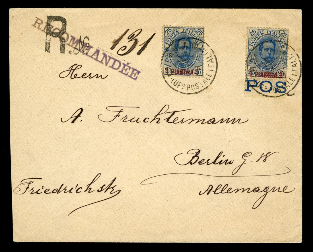 #1, 1900 Red "1 Piastra 1" surcharge on 25c Blue, two nicely centered singles, one with part imprint in the bottom selvage, both tied by clear strikes of "La Canea/Postale Italiano/11 3 01" datestamp to registered cover to Berlin, two registry handstamps at upper left, transit and arrival backstamp, very fine and scarce usage (Sassone #1).
