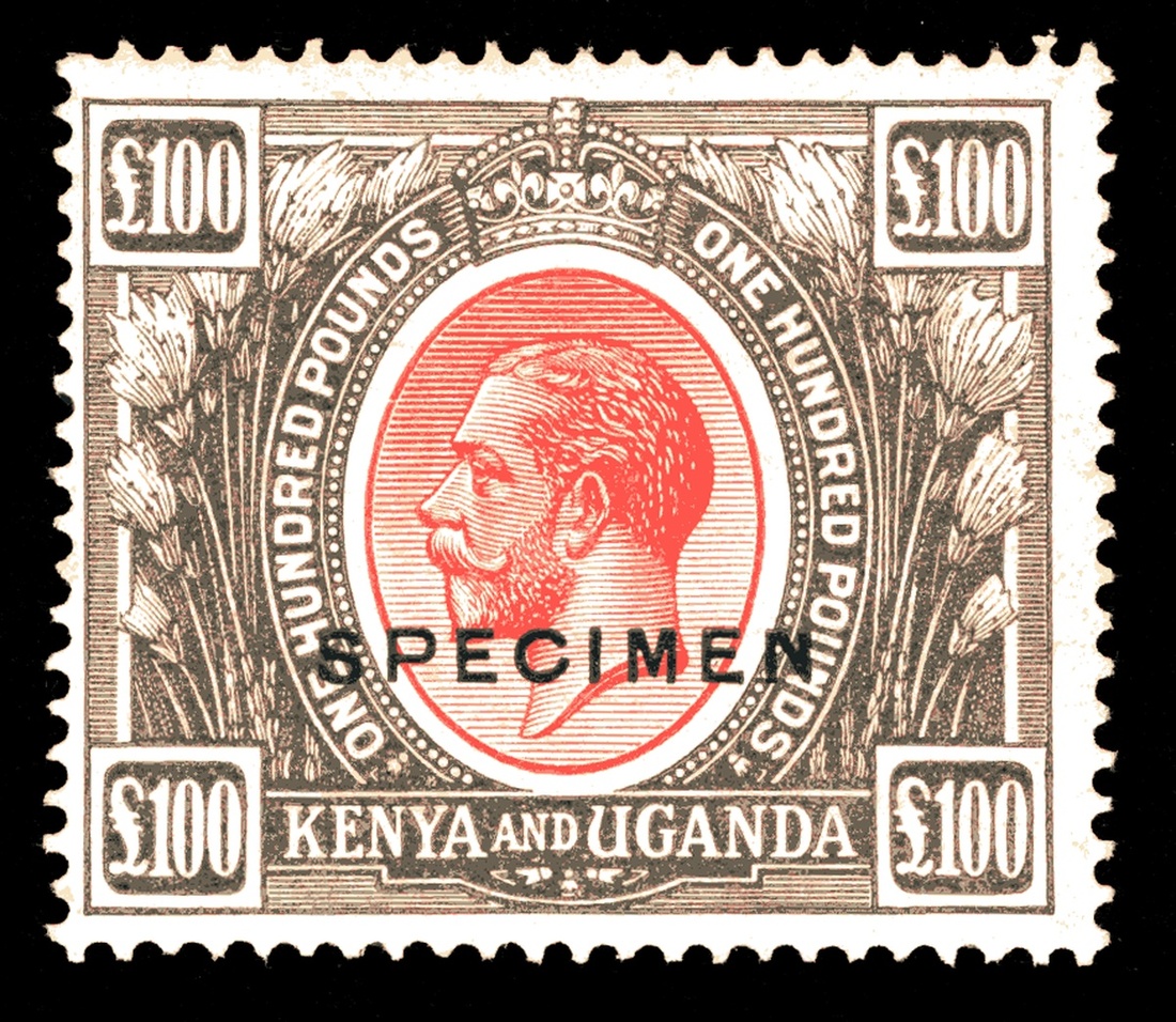 #41Fs, 1922 £100 Black and red, overprinted "SPECIMEN," o.g., l.h., fine and scarce (S.G. #105s; £4,250).