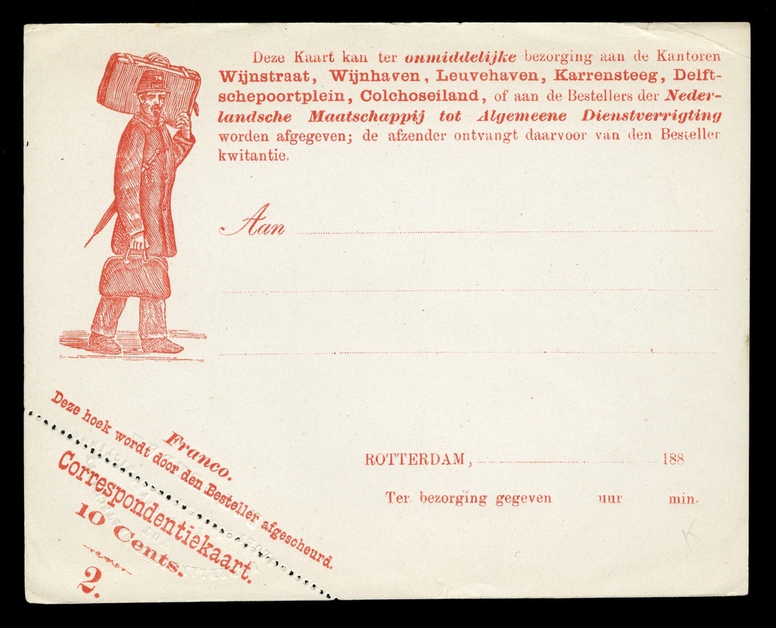 H&G #M7b/28, 1872/90 10c and 7½c Local post cards of Rotterdam, collection of fourteen different mint of the these unusual postal cards, all with a perforated lower left corner, one with a design of a man holding a sign, the rest of a man with two cases and an umbrella, three are 10c values in various colors and the rest are 7½c values in various colors, all but two have different numbers in the bottom left corner, nine are the larger format and more or less fit the H&G description for numbers #M15-22 except that all have "Franco" in various type styles except for #M15, the five smaller size are as described for #M24-28 with all upper case "FRANO.", fine-very fine; this is a very scarce type of postal stationery and the first that we have offered.
