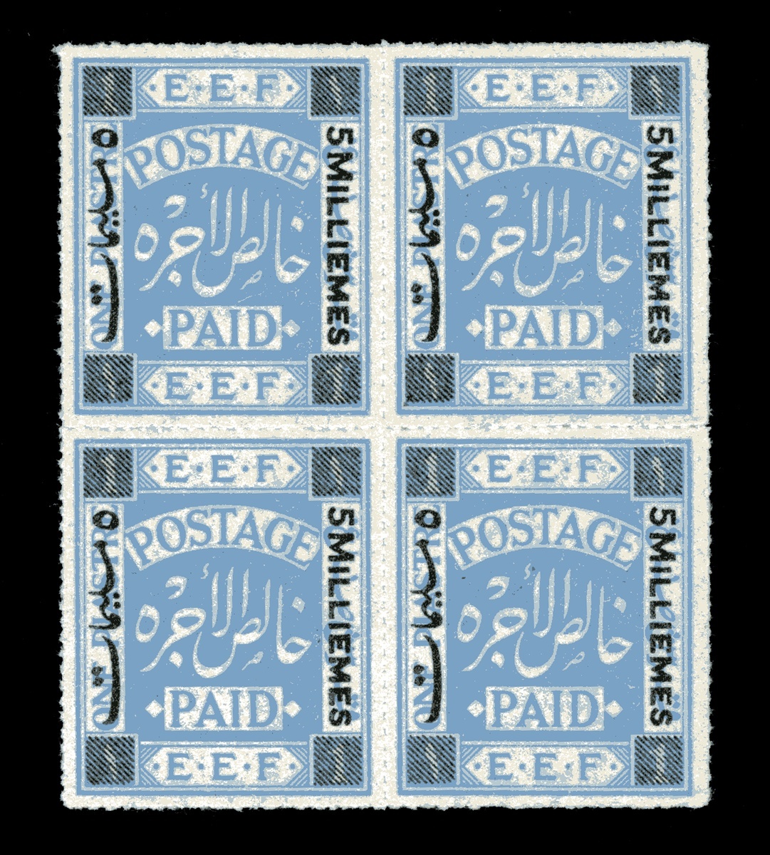 #1a, 1918 5m on 1Pi Gray blue, without gum as issued, mint block of four, fresh and very fine (S.G. #2; £440).