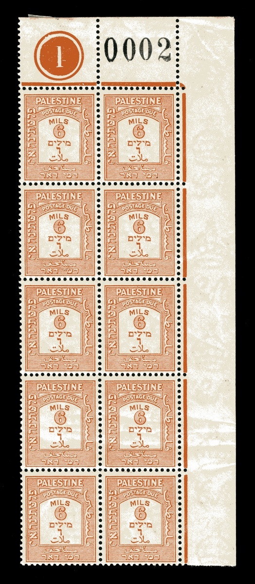 #J12-20, 1928-45, 1m-50m Postage dues cplt., top right corner margin control blocks of ten (2x5), 1m, 4m, 8m, 20m and 50m missing the right selvage, o.g., hinged in the selvage only, the stamps n.h., some minor gum bends, fine-very fine (S.G. #D12-20; £420 for hinged).