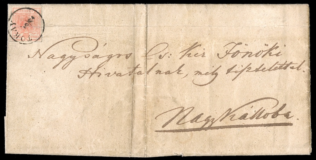 #3e var. 1854 5kr Red (Ty.IIIb) with Tokay rouletting on machine-made paper, single franking tied to entire folded letter to Nagy Kallo by clear "Tokay 3/2" c.d.s, the stamp is well centered and shows clear full rouletting on all four sides, the letter has file folds, one of which affects the stamp, nevertheless a nice example of this very rare perforation, also includes a similar cover with a 3kr Red (Ty. Ia) imperforate to cover to Debreczen by a "Tokay 19/5" c.d.s.; 2004 Visnyovszki certificate (Phil. Hun. 2,500.000Ft = $8,680.00; Ferchenbauer €12,500).