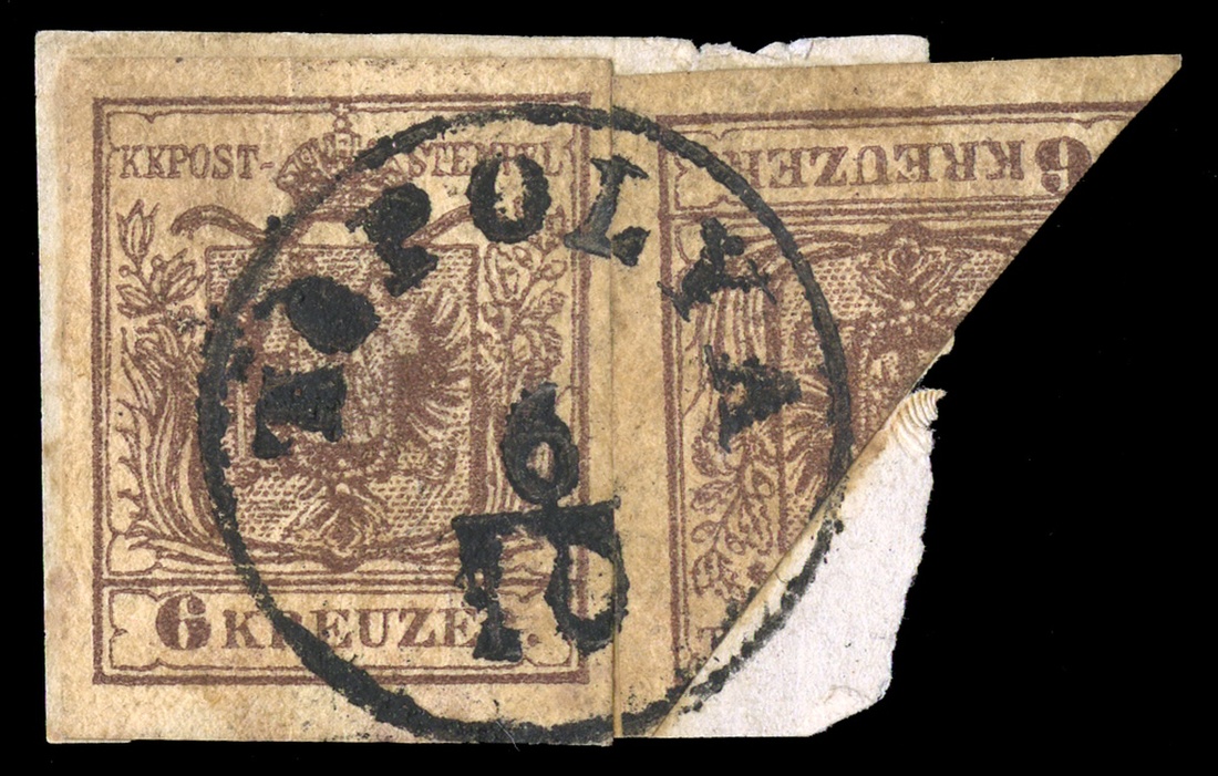 #4, 4c, 1850 6kr Brown (Ty. III), diagonal half used as 3kr, a single and diagonal bisect on handmade paper, tied to small piece by ""Topolya 6/10" c.d.s of the Serbian area, cancel neatly ties both stamps together and across the bisected side, this being the scarce of the two ways the 6kr bisct is used making 9kr, fine and scarce