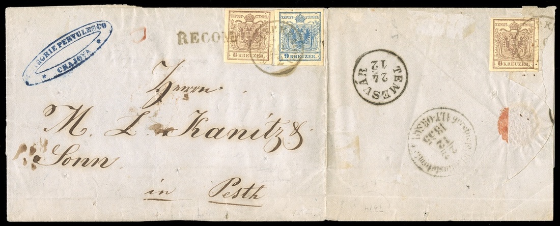 #4, 5, 1850 6kr Brown (Ty. III) and 9kr Blue (Ty. IIIb), well margined singles on the front of registered and disinfected folded cover out of Austrian occupied Walachia (southern Romania) with additional 6kr Brown on reverse (a bit damaged in opening as usual but appears very fine), stamps tied by light "K.K. Ost. F.P. Krajovea 20/12" field post c.d.s., posted to Pesth, on entry into the Empire at Alt Orssova in the Banat-Serbian Military Border District it was disinfected with rastel punch marks in the cover (not affecting stamps) and received "Gereinigt K.K. Rastel Amt./Alt-Orsova.22/12 1855" disinfection pmk. (Cleaned K.K. Rastel Office), Temesvar transit and backstamped Pesth, a very fine cover and a very rare disinfected cover out of this occupied territory.