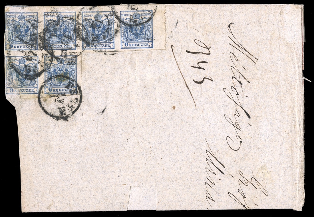 #4, 5, 1850 9kr Blue (Ty. IIIb) block of six and 6kr Brown (Ty. III), on handmade paper tied to large portion of large registered folded cover by "Pesth 13/1" c.d.s., the block is an irregularly shaped block with a block of four with two additional stamps to the right on the top row, the right one being a right sheet margin copy (6-7mm), clear to mostly extra-large margins, closer at the left of the block with some edge damage to the left vert. pair, on the reverse is the 6kr single for the registry fee tied by a second strike of the Clausenburg backstamp apparently having been missed at the post office of origin, the cover wrapper has been reduced with some portions missing, fine appearance; an extremely rare 9kr multiple and franking paying the 54kr rate for a letter weighing 5-6 loths; 2004 Sismondo certificate.