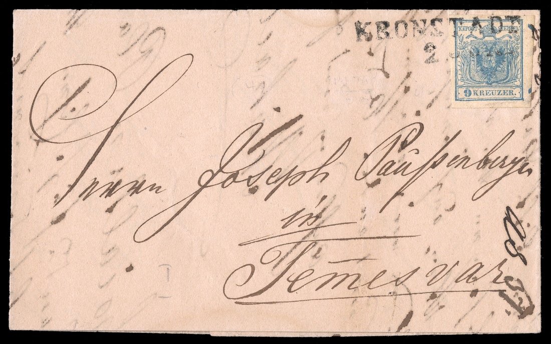 #5f, 1850 9kr Pale blue (Ty. I) on Second Day Cover, on handmade paper with stamp tied to folded letter to Temesvar by straight line "Kronstadt/2 Jun" pmk., letter datelined "Kronstadt im 2nd Jun 850" confirming the year date and second day usage, backstamped with straight line "Temesvar/5 Jun" h.s., stamp with early pale shade and full balance margins, while not the value of the FDC the second is nonetheless a very rare and collectable cover.