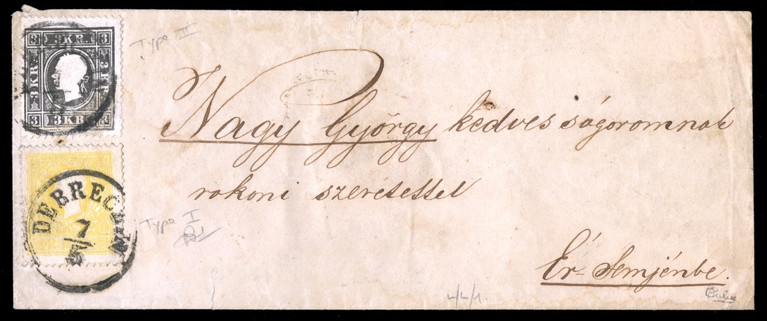 #6a, 7, 1858 2kr Yellow (Ty. I) and 3kr Black (Ty. II), tied to petite cover to Er Semjen by "Debreczen 7/5" c.d.s., both stamps are well centered, the 3kr is slightly rubbed, cover with small tear at top, fine and attractive, not only a scarce combination of values to make the letter rate but a scarce instance of mixed types; signed R. Calves identifying the types.