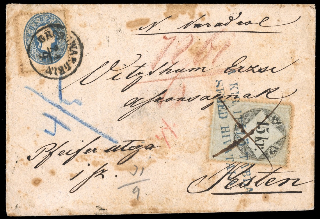 #16, 1860 15kr Blue and 15kr Black and green revenue, tied to cover to Pest, the postage is tied by "Grosswardein 21/9" c.d.s., backstamped, the revenue is tied by blue two line "kir. Itelotabla/Seged Hivatala (Office of the assistant Clerk of the Royal Court of Appeals), additionally with ms. "X", the fiscal stamp pays the fee for the document that was enclosed in the cover, normally this would have been applied directly to the document, it is however a rare use of a fiscal used on cover even though it did not do postal duty, foxing to the cover affecting the edges of the stamps, a rare usage; 1991 Otto Schaffling certificate.