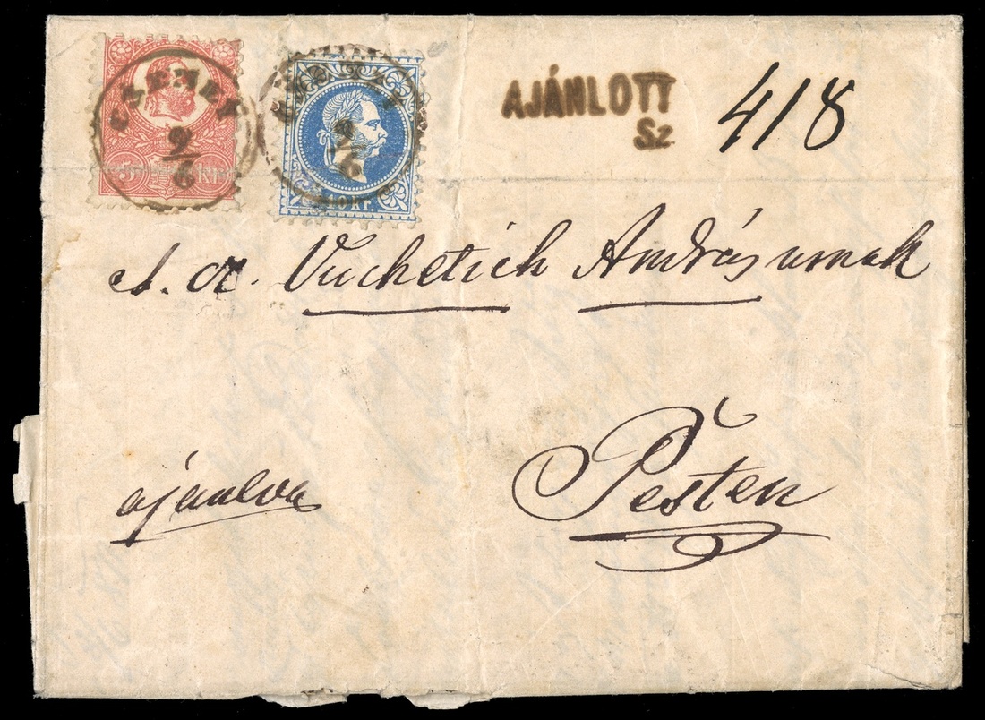 #30, 1867 10kr Blue, coarse print, in mixed franking with Hungary #3, 1871 Rose, the first lithographed issue, both tied to 1871 entire folded letter to Pest by "Cseney 9/6" c.d.s., of the Temes District, Gyertyamos transit, backstamped, cover with file fold that unobtrusively affects both stamps and small edge tears along bottom cover fold, still attractive and a nice example of very rare mixed franking with Hungary's scarce first issue.