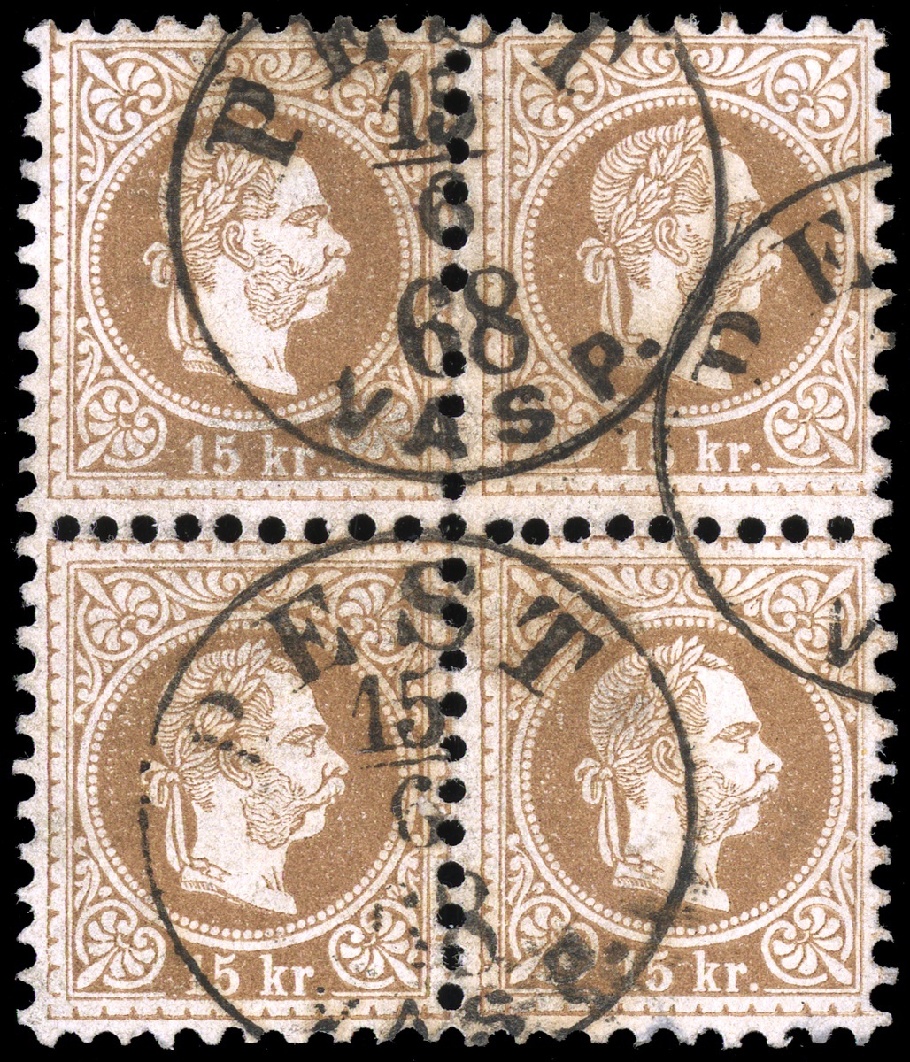 #31, 1867 15kr Brown, coarse print, attractive used block of four, the top pair shows small portions of the block watermark, clear "Pest/Vasp. 15/6 68", well ce\ntered and very fine.