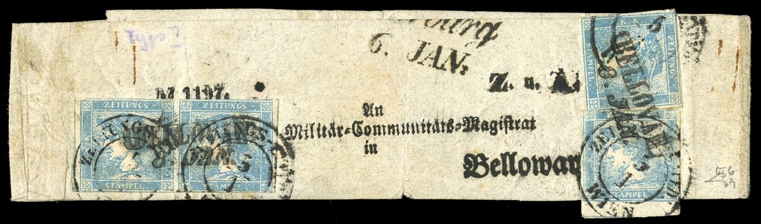 #P1a, 1851 (0.6kr) Blue (Ty. 1b) newspaper stamp, horizontal pair and two singles tied to newspaper wrapper to Bellovar in the Croatian-Slovonian military district, tied by "Zeitungs- Exped/Wien 5/1" double circle c.d.s. plus each two stamps centrally canceled by two line "Bellovar/8, Jan." h.s., stamps mostly with clear margins, some large, to just into the frame at places. a fine and nice usage; 1997 Ferchenbauer certificate.