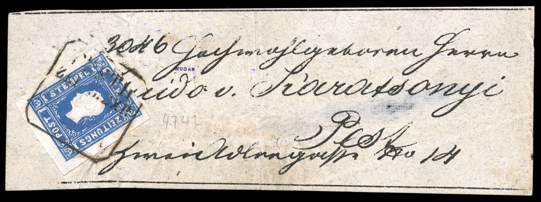 #P2, 1858 (1kr) Blue (Ty. I) newspaper stamp, tied to front portion of newspaper wrapper used locally by boxed "Pesth/Zeitu. Exp" pmk., stamp is fresh and attractive with large margins all around, choice very fine; signed Ferchenbauer and others
