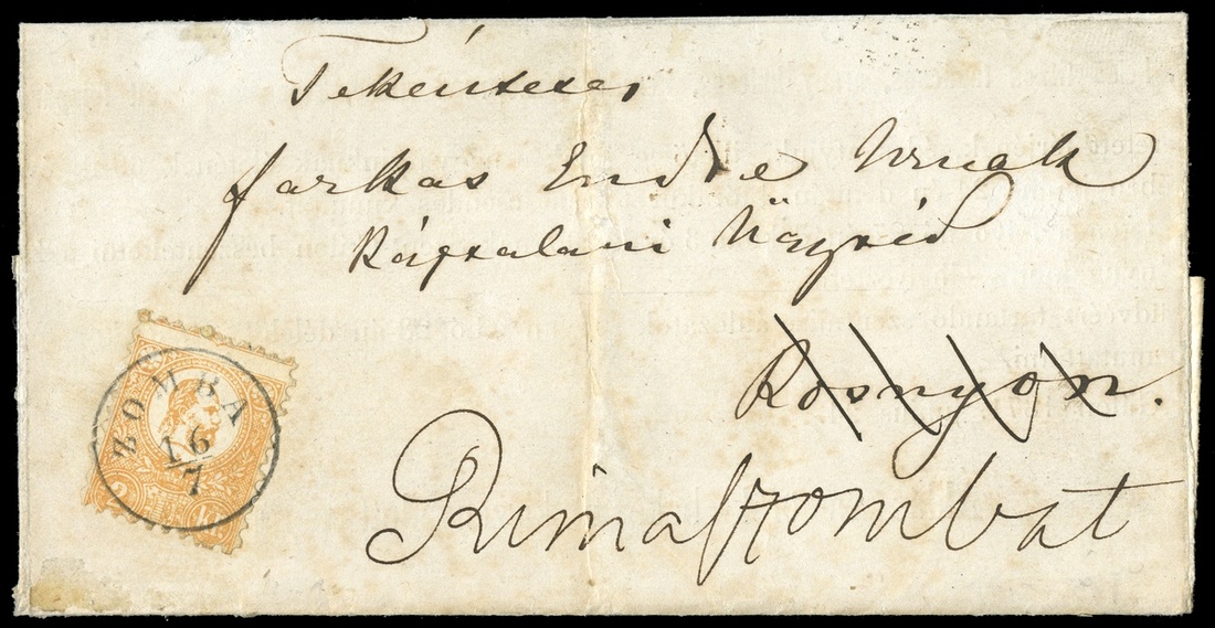 #1, 1871 Orange lithographed, single tied to 1871 folded letter being a death notice, in single franking tied by "Zomba 16/7" to Rosnyo and then forwarded to Rimaszombat, appropriate transits of Rusnyo and backstamped, stamp with normal centering to the bottom and trace of aging around perfs., fine and scarce as a single franking, especially being forwarded (Phil. Hung. #1).