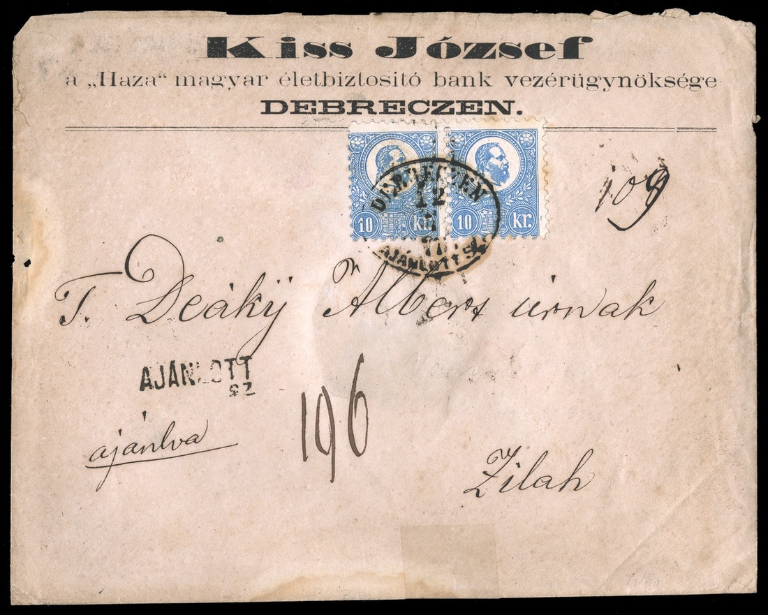 #4, 1871 10Kr Blue lithographed, horizontal pair tied to registered cover to Zilah in Transylvannia by "Debreczen/Ajannotts/12 7 71 oval registry cancel, Csucsa transit and backstamped, stamps with strong rich color and attractive impression, centered to the bottom left, slight postal wear to cover and the barest trace of aging to stamps, fine; an attractive multiple and usage (Phil. Hung. #4; 170,000Ft = $590.00 for two 10kr on cover).