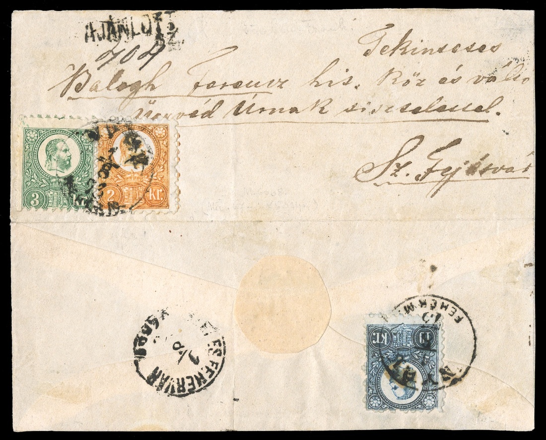 #7, 8, 10, 1871 2kr Orange, 3kr Green and 10kr Blue engraved, a lovely three color franking with the 2kr and 3kr on the front and 10kr on reverse, tied to 1873 petite registered cover to "Szekes Fehervar by Nyek/Feher Megge/1 8 73" c.d.s., backstamped, cover and stamps are fresh with normal centering, cover opened out for display, very fine and attractive cover (Phil. Hung #8, 9, 11; 250,000Ft = $858.00 for this combination).