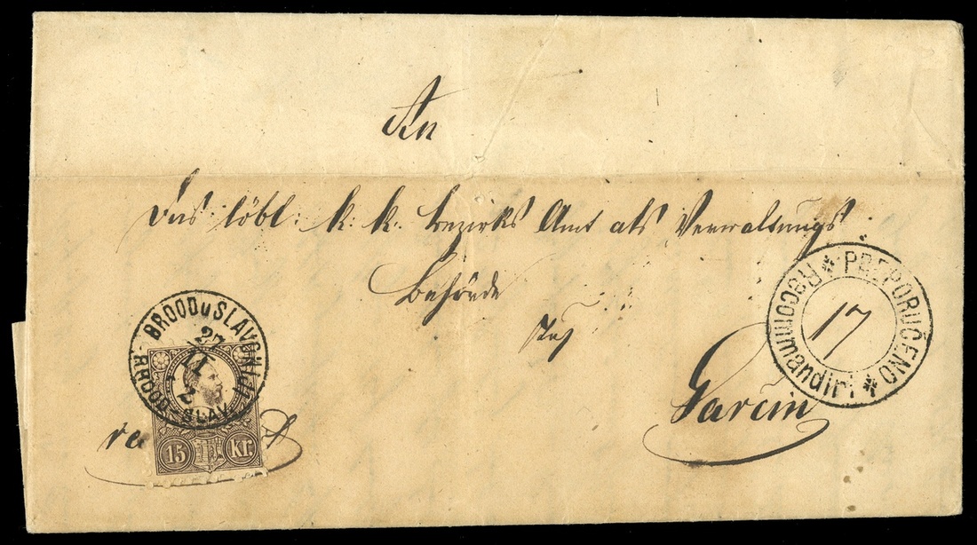 #11, 1871 15kr Brown engraved, single franking tied to 1872 entire folded letter to Garcin by bi-lingual "BrooduSlavoniji/Brood-Slav. 27/11 72" c.d.s., both in the Croation slovonian border district, double circle bi-lingual Croation registry h.s., the the letter is a document with a 50kr border district revenue tied by a military cancellation, the 15kr is an exceptionally attractive stamp being well centered with the perforations clearing the design all around, very fine and a scarce combination revenue document (Phil. Hung. #12).