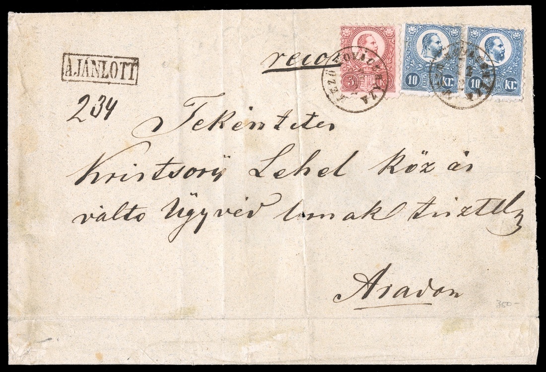 #9/11b, 1871 5kr-15kr Engraved issue cover collection of four registered covers and a front showing various registry frankings including scarcer 5kr carmine and pair of 10kr Blue to make a 25kr rate tied to folded cover to Arad by Mezo Kovacshaza c.d.s., another with 10kr vertical pair making the 20kr rate tied by "Misolcz 15/6 74" to neat cover to Budapest (1990 Ferenc Orban certificate), then three single franking 15kr Brown on two covers and a front with different shades including a scarce 15kr Black brown tied to nice cover to Szeged by "Torokh Kakizsa 3/6 73" c.d.s., all with the proper registry markings, covers backstamped, fine-very fine (Phil. Hung. #10a/12b).