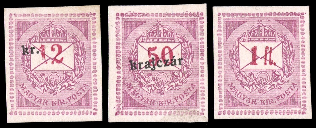 1888 1kr-1Ft Envelope design proofs on card nine different values in rose lilac with red numerals, imperforate on thin card, the eight low values with "kr." or "Krajczar" overprints except for the 15 which is without overprint, very fine and quite scarce.