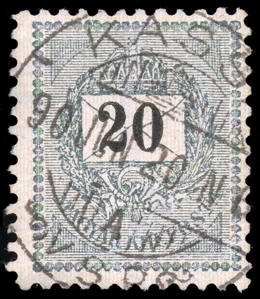 #30i, 1888 20kr Gray electrotype, perf. 11½, watermark "kr" in circle, used with neat "Kassa" pmk., this perforation is the the scarcer of the two used and this 20kr value is the key stamp of the series mint or used, quite well centered for this, nearly very fine and a very elusive value (Phil. Hung. #36eB; 180,000Ft = $625.00).