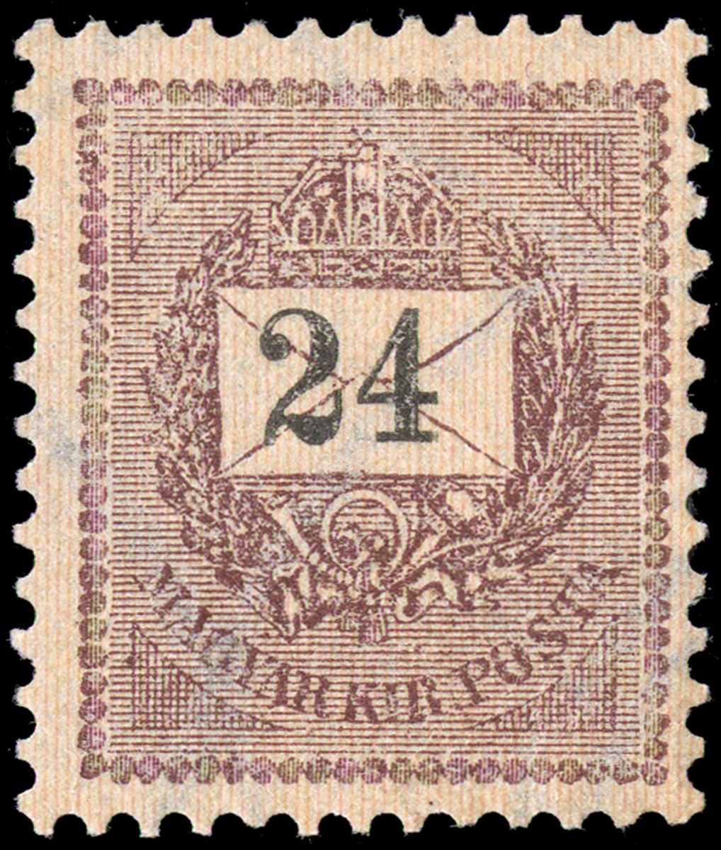 #35Ac-46b, P5, 1899 1kr-50kr Envelope series electrotype, perf. 12x11½, watermark Crown in circle (type III), complete for the 12 different values plus the 1kr Orange newspaper stamp, all are fresh with bright colors, o.g., the key 24kr Violet brown and red is never hinged, fine-very fine (Phil. Hung. #55-67; 770,000Ft = $2,673.00).