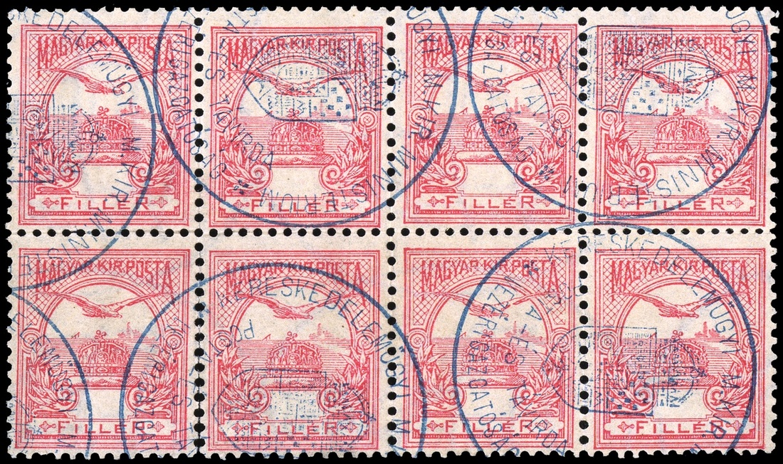 #55 var., 1900 10f Carmine "Turul" without value, block of eight (4x2), all lacking the black numeral "10" value, cancelled with blue post and telegraph seals appearing to be a devaluation marking, some perf, separation, fine -very fine; not listed in the major catalogs so apparently not an issued error but mentioned in some specialize handbooks; also includes an imperforate plate proof of the same variety on yellowish paper (Phil. Hung. #75 var.).