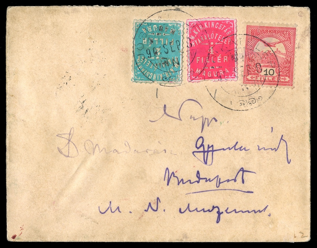1903 2f Green and 4f Red Magura Hotel Post stamps, in mixed franking with 10f Carmine (#55) tied to cover to cover to Budapest by "Josikatelep;903 Srp 8" c.d.s., backstamped, covers mailed in early September of 1903 were mailed to Gyula Madareesz or his family, small roulett faults to the hotel stamps, a fine and very rare legitimate use of these scarce hotel stamps.
