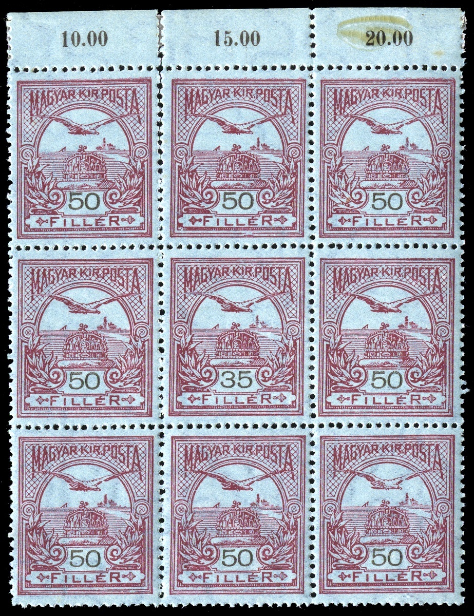 #96, 96a, 1913 35f Lake on blue, error cliche in plate of 50f, center stamp in a top margin block of nine of the 50f Lake on blue, very well centered, o.g., stamps are never hinged, very fine; an excellent way to display this scarce color error (Phil. Hung. #151Tny; 130,000Ft + $451.00).