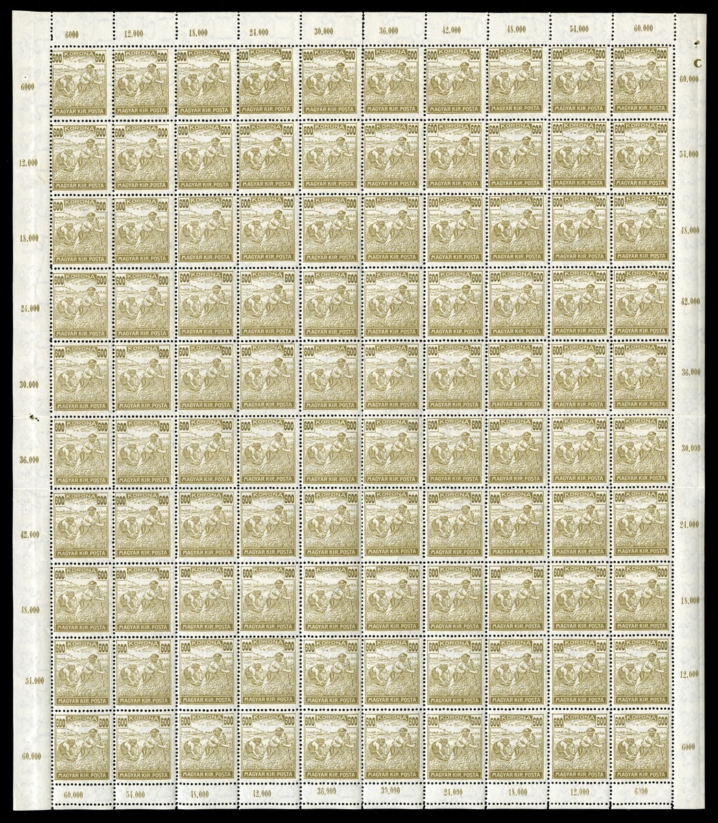 #362, 362 var. 1924 600K Olive bister, "800 " plate error at top right corner,, full sheet of 100 of this value, position 12 shows a value designation of "800" instead of "600" at top right, the sheet is complete with full selvages but has been folded to a smaller size for display, o.g., n.h, stamps are fine-very fine with the variety being fine; not listed in Scott or Phil. Hung. but the value for the normal mint stamps of this high value is Scott $575.00 (Phil. Hung. #379; 200,000Ft = $694.00 for normal).