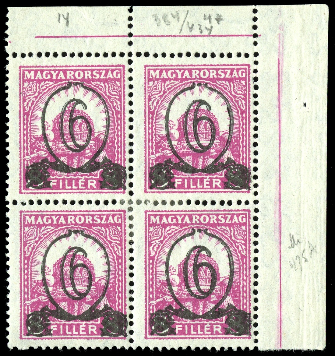 #451a, 545a, 1931 6f on 8f Magenta, perf. 14x14½, mint corner blocks of four in each of the two watermarks that this surcharge was issued in this scarce perforation, o.g., small h.r., fine-very fine; each stamp signed H. Bloch (Phil. Hung. #502B, 506B; 70,000Ft+ = $243.00+).