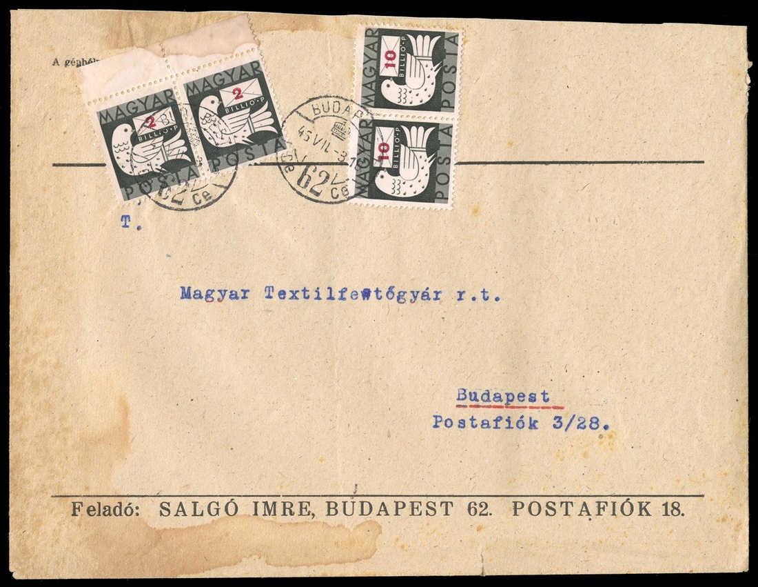 #761, 764, 1946 2bil P Greenish black pair and 10bil P Greenish black pair, tied to locally run First Day Cover by "Budapest/46 VII 3" c.d.s., backstamped, some edge stains at left, fine; a rare commercial inflation period cover being from 22nd period which was only in affect July 1-3, thus the billion value doves stamps could only be used for the one day of July 3rd on the first day. (Phil. Hung. #965, 968).
