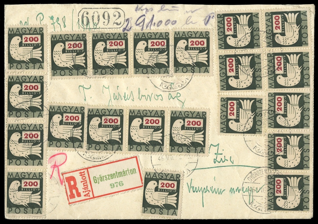 #768, 1946 200bil P Blackish green (45x), a handsome and scarce registered (hyper) inflation period cover bearing 45 200billion P stamps (21 on the front and 24 on the reverse), tied by "Gyorszentmarton/46 VII 9" c.d.s., posted to Zire and backstamped the next day, very fine; this desirable and scarce cover is from the 24th rate period (July 8-11), the total postal cost was 300,000 billion P for postal fee and registration, 291,000 billion P was paid in cash and 9,000 billion P in stamps; a beautiful illustration of the problems of sending a normal letter in these periods of extreme inflation after the war (Phil. Hung. #972).