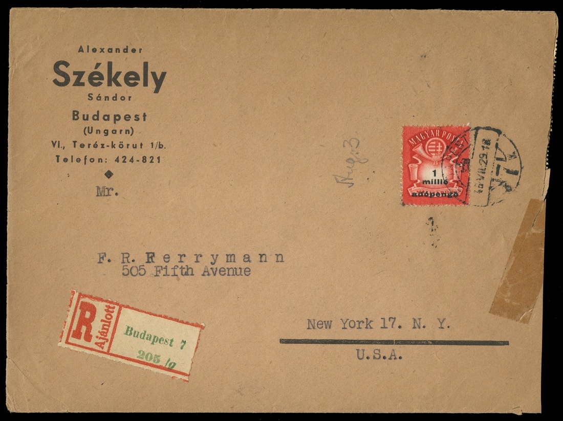 #782, 783, 1946 500ez aP Green (10x) 1 mill aP Vermilion (3x), attractive and scarce late inflation period registered cover to the United States, one 1mil aP on front and pair on reverse as well as a corner block of 10 of the 500ez aP value on the reverse, All tied by "Budapest/ 46 VII 29" c.d.s, backstamped New York, fresh and very clean, very fine; this was very late in the inflation period before currency reform on Aug. 1st with stamps that now used a special Ado (tax) pengos currency; these values were only in use for a few days, these two values being issued Jul. 23rd and 26th respectively; a rare foreign mail usage (Phil. Hung. #990, 991).