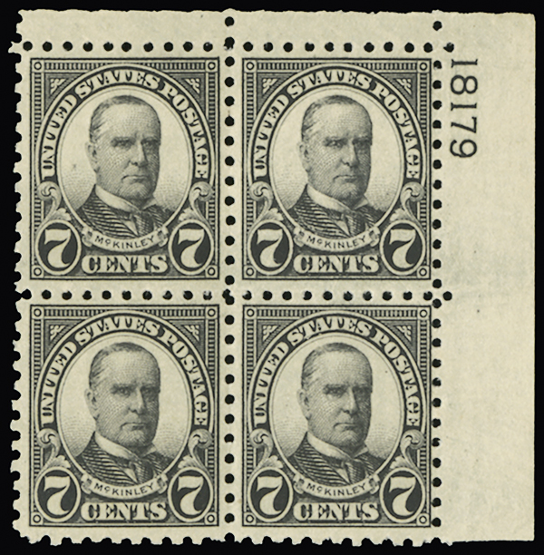 #588, 7c Black, top right corner margin plate no. 18179 block of four, o.g., n.h., fine-very fine.