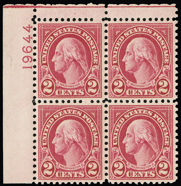 #634A, 2c Carmine, Ty. II, select top left corner margin plate no. 19644 block of four of this scarce and difficult type, very well centered for this, intense color, post office fresh, o.g., n.h., very fine; 1994 PF certificate.