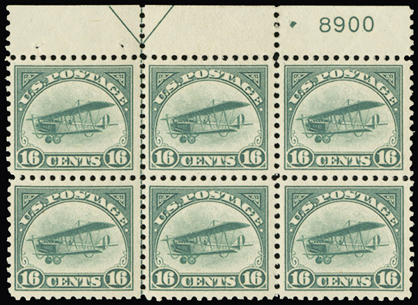 #C2, 16c Green, select full top margin arrow and plate no. 8900 block of six, rich luxuriant color, well centered, fresh and intact, o.g., n.h., very fine and choice.