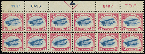 #C3, 24c Carmine rose and blue, full top margin arrow, two "TOP" and plate nos. 8493, 8492 block of twelve, post office fresh, strong and intact perforations, o.g. with the usual natural gum bends, never hinged, fine-very fine.