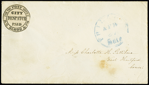 #15L9, D.O. Blood & Co., (2c) Black, cut-to-shape and uncancelled on cover to West Hartford, Ct., entered the mails with blue "Philada, Pa./Apr 27" datestamp with integral "5 cts" rate, includes the 1846 dated original enclosure, very fine; 2018 PF certificate.
