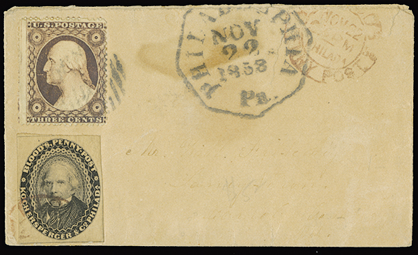 #15L18, Blood's Penny Post, (1c) Black, large margins all around, tied by red "1" in oval cancel to lady's cover with matching Blood's double circle datestamp, entered the mails with 3c Dull red (#26) tied by open grid and with matching octagonal "Philadelphia, Pa.,Nov 22, 1858" datestamp, cover with tear and stained spot affecting the Philadelphia datestamp, otherwise fine and rare; the red cancellation was only in use for five days from 22-26 November, 1858, with only sixteen examples recorded, of which this is an earliest recorded example.