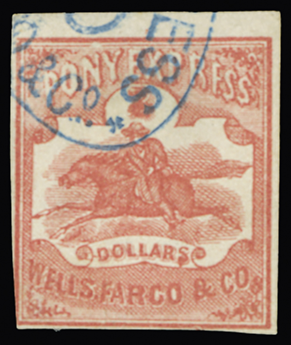#143L1, Wells, Fargo & Co. $2.00 Red, used with neat blue oval company handstamp, large margins to just touching at lower left, fresh and fine.