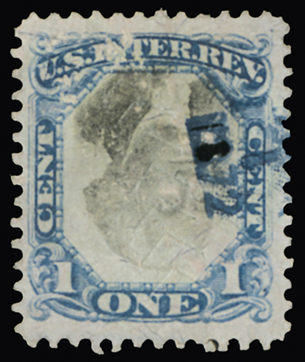 #R103a, 1c Blue and black, Inverted Center, unusually well centered and margined for this, good colors, herringbone cut cancel and blue hand cancel with the "1" and "8" of the 1878 date heavily applied causing puncture holes, otherwise very fine.