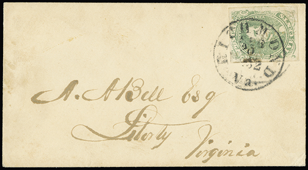 #1 var., 5c Green, Stone 2, white shirt variety, four uniformly large margins, tied to cover to Liberty, Va. by "Richmond, Va./Sep 20, 1862" datestamp, cover with a lightened edge stain at left, otherwise very fine; 2013 PF certificate.