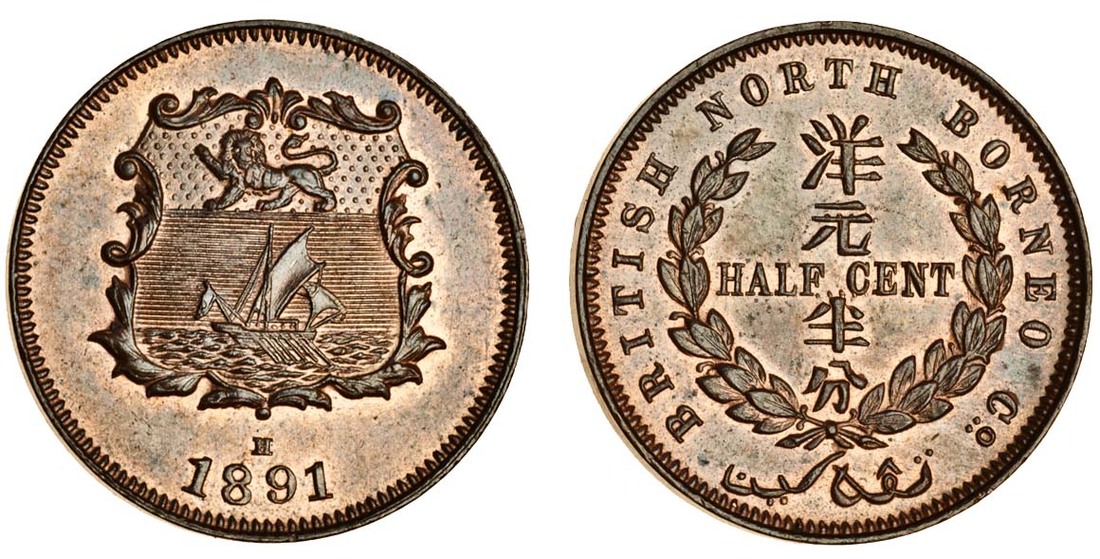 British North Borneo, Half-Cent, 1891 H, shield of the British North Borneo Company, date below, rev. value within wreath (KM 1, Pr.32), uncirculated and with much lustre
