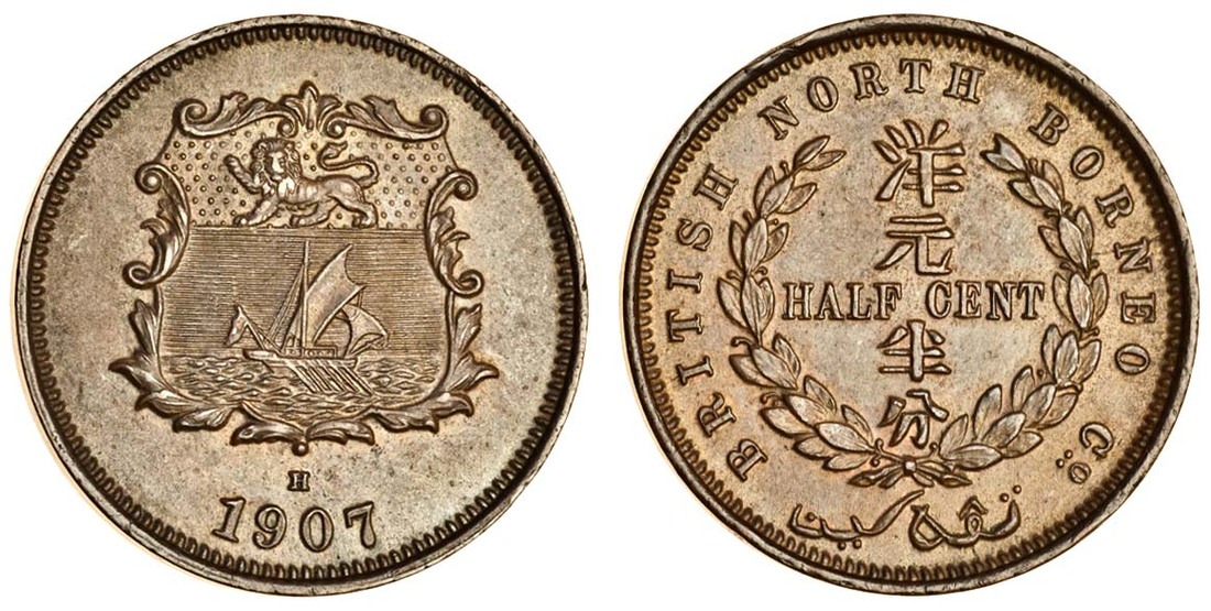 British North Borneo, Half-Cent, 1907 H, shield of the British North Borneo Company, date below, rev. value within wreath (KM 1, Pr.33), good extremely fine