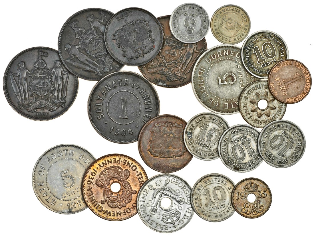 British North Borneo, 5-Cents (2), 1903, 1928, Cents (3), 1888 H, 1890 H, 1896 H, Half-Cents (2), 1887 H, 1891 H, Malaya, 10-Cents (2), 1948, 1950, Malaya and British Borneo, 10-Cent (3), 1953, 1957, 1961, 5-Cents (2), 1958, 1961, Cent, 1962, New Guinea, Shilling, 1945, Sixpence, 1935, Threepence, 1935, Penny, 1936, Sultanate of Brunei, Cent, AH1304, fine to extremely fine (20)